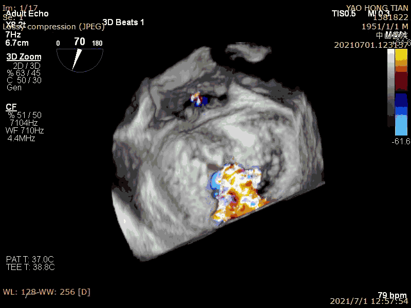 Patient: Male, 70 years old. Preoperative ultrasound diagnosis: Left ventricular ejection fraction (LVEF) 58%, left ventricular end-diastolic diameter (LVDD) 52mm, left atrial diameter (LAD) 57mm, pulmonary artery systolic pressure (PASP) 63mmHg. Severe mitral regurgitation caused by mitral valve leaflet malalignment, vena contracta (VC) 6*13mm, regurgitant area 19.8cm² (Figures 1-2).