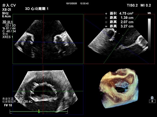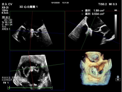 鉴于患者术前心功能差、多支架植入的特殊情况,手术全程需兼顾“精准操作”与“保护心功能”双重要求:在全麻与经食道超声的协同引导下,团队先突破心功能受损导致的术野稳定性难题,稳步经心尖建立手术轨道与输送鞘;随后聚焦二尖瓣2偏3区精准置入一枚Ⅱf型夹合器,成功攻占这一解剖位置深、毗邻结构敏感、容错率极低而操作难度陡增的区域。