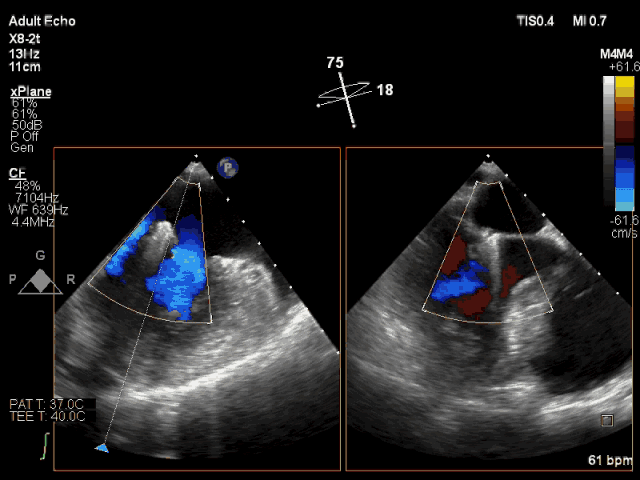 此次转播心脏超声机器为最新一代Philips EPIQ 7C,使用X8-2t食道探头进行术中经食道超声,采用TrueVue实时三维双容积视野同时显示二尖瓣左房观和左室观。新一代超声机器分辨率高、图像处理速度快、图像界面舒适,使得手术非常顺利,手术转播的导管操作时间仅用8分钟。患者术后即刻效果满意,反流从重度减少到轻度。
